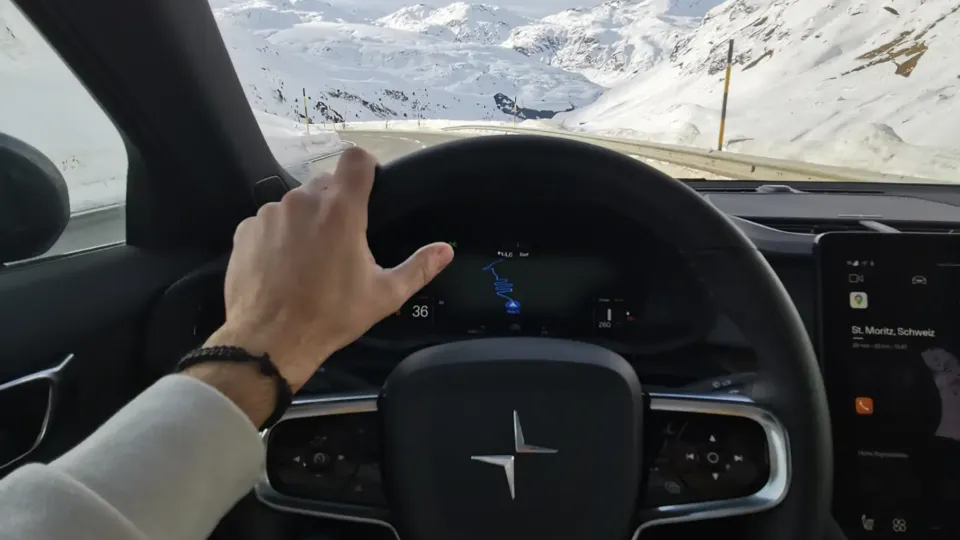 Nach gut 200 Kilometern abwechslungsreicher Fahrt über Chur durch die Region Viamala und über den verschneiten Julierpass auf 2'284 m.ü.M. erreichte Dominik schliesslich das einzigartige Winterwunderland Engadin. Bei gut aufgewärmtem und entleertem Akku boten sich ideale Bedingungen für unseren Ladetest beim GOFAST Schnelllader bei der Auto Mathis AG in St. Moritz. Und auch hier zeigt der China-Schwede eine gute Performance. Eingesteckt bei 5 Prozent, lädt der Polestar 2 während der ersten 10 Minuten beeindruckend mit über 130 kW und bis zu einem Akkustand von 50 Prozent konstant über 100 kW. Nach gut 40 Minuten war die Batterie wieder bis zu den für Schnellladungen empfohlenen 80 Prozent gefüllt und für die Talfahrt bereit.